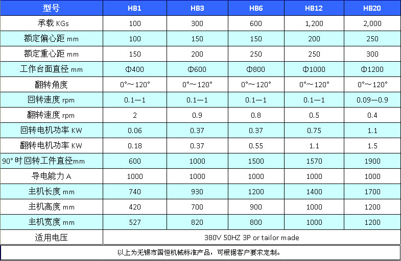 HB系列变位机标准设计承载100KG—2000KG,广泛应用于环缝手动或自动焊接以及工件的定位。普遍应用于压力容器、金属冶炼、电力、化学、金属结构以及其他行业。可根据客户要求定制。
