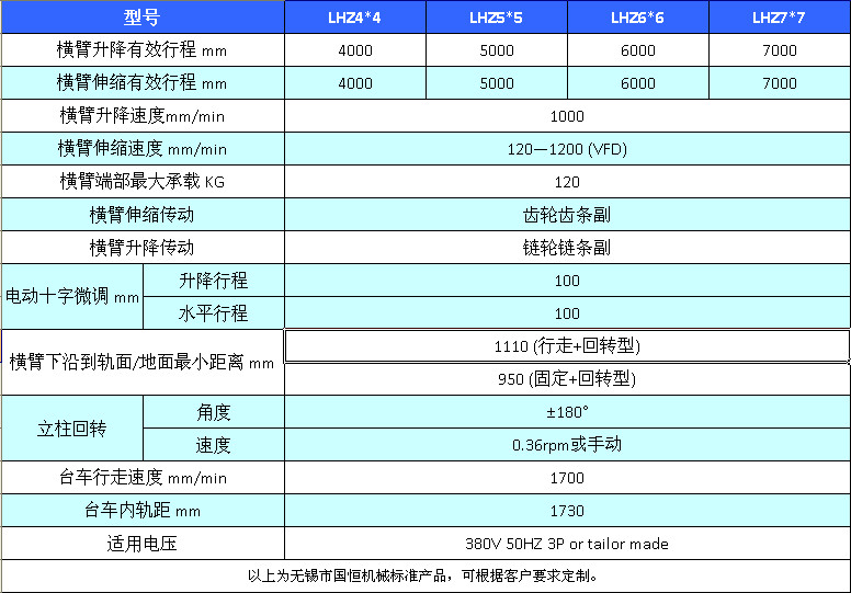 根据横臂末端承载能力,我司焊接操作机可以分为LHQ轻型、LHZ中型、LHW重型和HCJ超重型。每一个类型的操作机都可以按照客户的要求进行设计制造。以下为我司标准LHZ中型焊接操作机的主要参数。